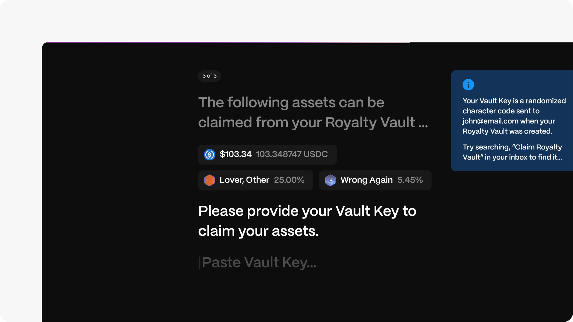 * To claim, payees will need to retrieve the **Royalty Vault Key** from the email that was sent to them when their vault was created.